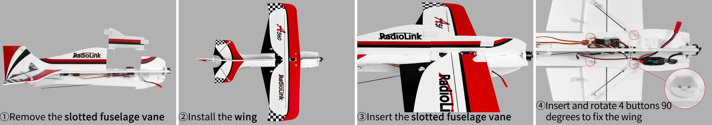 Diassemble the buttons to fix the wing. Remove the slotted fuselage vane and wing. Insert the slotted fuselage vane back.