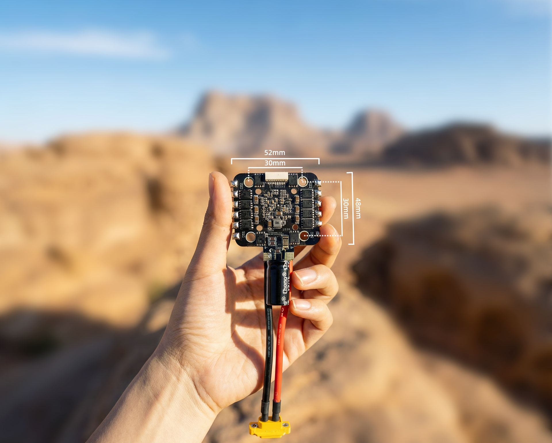 With dimensions of 52*48mm(20.47″*18.9″), a 30*30mm(11.81″*11.81″) mounting hole pattern, and a weight of just 35.3g(1.25oz), this product achieves excellent size and weight control while maintaining high current capability. This provides greater flexibility for overall aircraft balance and flight endurance.