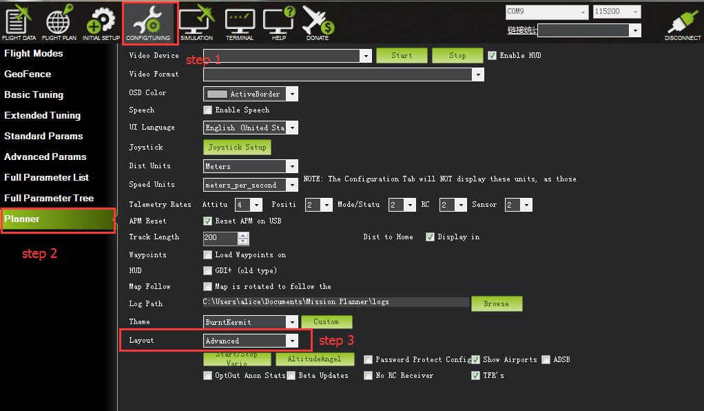If you meet the above three problems, please set Layout from“Basic”to“Advanced”in CONFIG/TUNING menu if any of the three questions as below encontered when you installing the Mission Planner.
