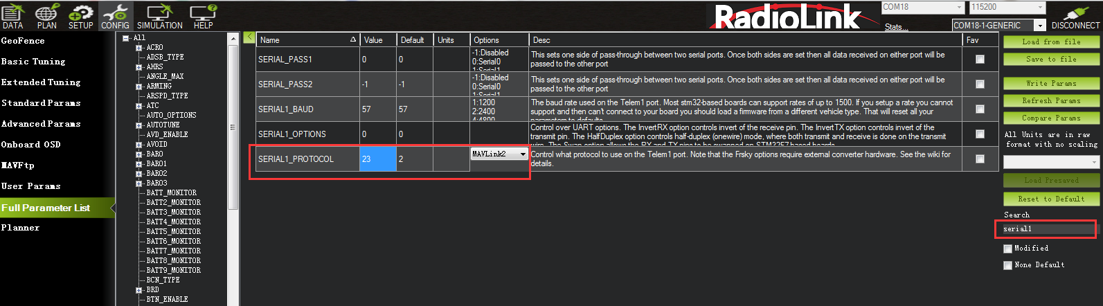 All settings of the flight controller can be set or adjusted. You can enter Full Parameter List to search the parameter you want to modify and then modify it. After the modification, please remember to click Write Params on the right.
