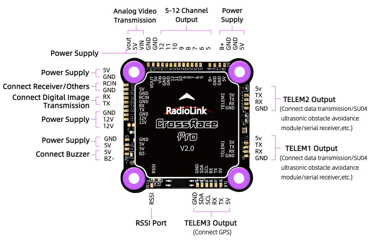 5V: Regardless of the voltage of the battery that powers the ESC and flight controller, the 5V pin on the CrossRace Pro flight controller always outputs 5V voltage to external devices.