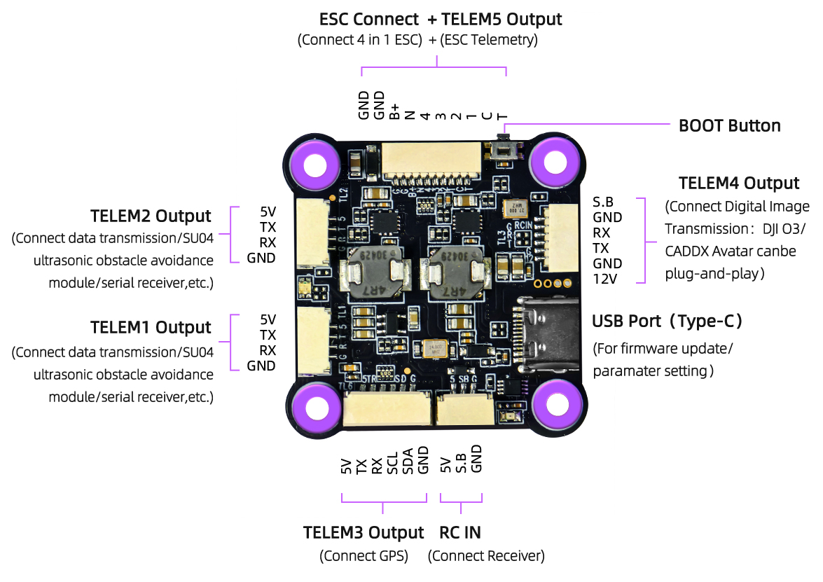 B+: The battery voltage that powers the ESC and flight controller is the voltage output by the B+ pin of the CrossRace Pro flight controller. Therefore, when an external device needs to be powered through the B+ pin of the CrossRace Pro flight controller, please make sure the battery voltage does not exceed the working voltage range of your external device to avoid damaging the external device due to high-voltage input.