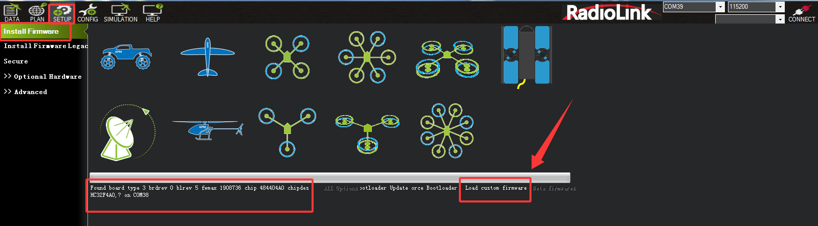 Open Mission Planner. Click SETUP--Install Firmware. Connect CrossRace Pro to the computer via a Type-C cable. Found board appears in the lower-left corner, indicating that the flight controller has been recognized. Click Load custom firmware in the lower-right corner (as shown below) and select the firmware downloaded from RadioLink official website. Follow the prompts to complete the firmware installation and wait for the flight controller firmware to install.