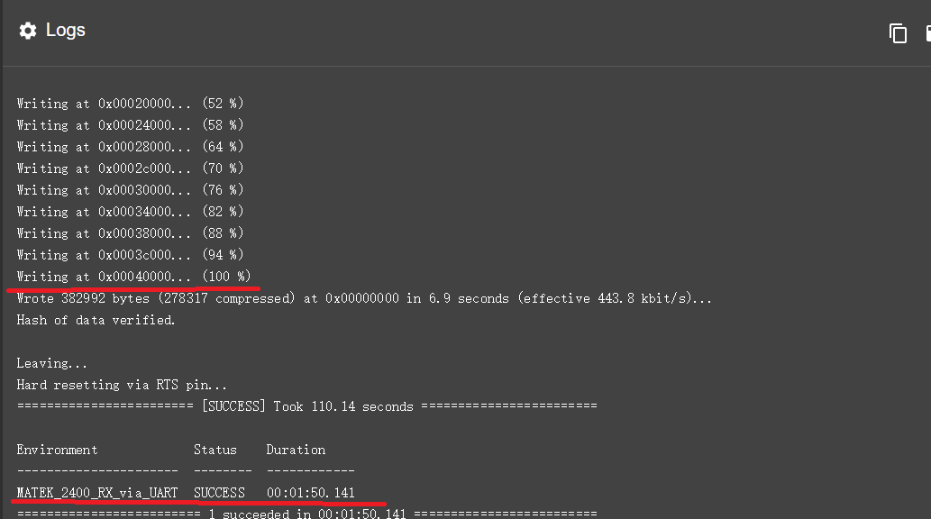 The Logs window displays the entire compilation process. When the following page appears, it means the program has been downloaded to the receiver, and you will see a green "Success" under Result!