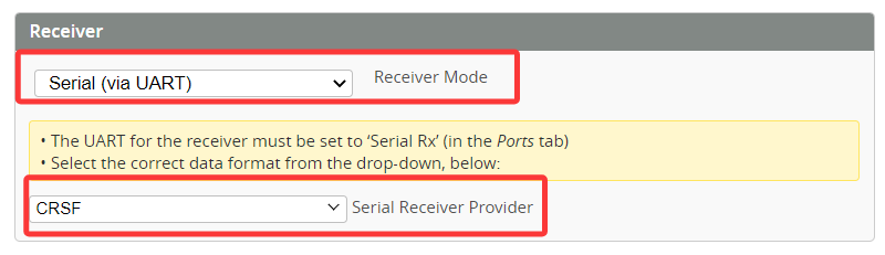 Click Receiver menu. Select Serial (via UART) for receiver mode, and set CRSF for serial receiver provider.
