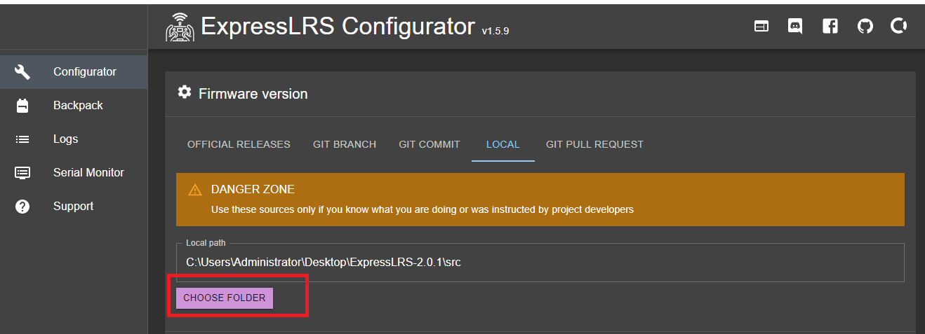 Open ExpressLRS Configurator. Select Configurator -- click LOCAL, and use offline local compilation.
