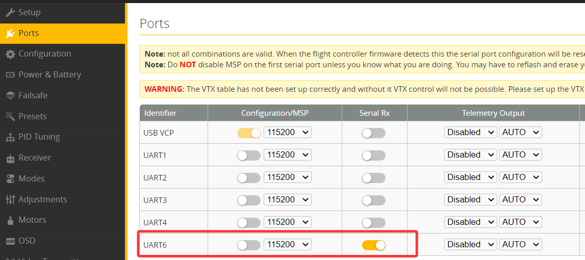 Connect the flight controller to the computer. Open Betaflight Configurator and connect. Click Ports menu and enable Serial RX of UART6.