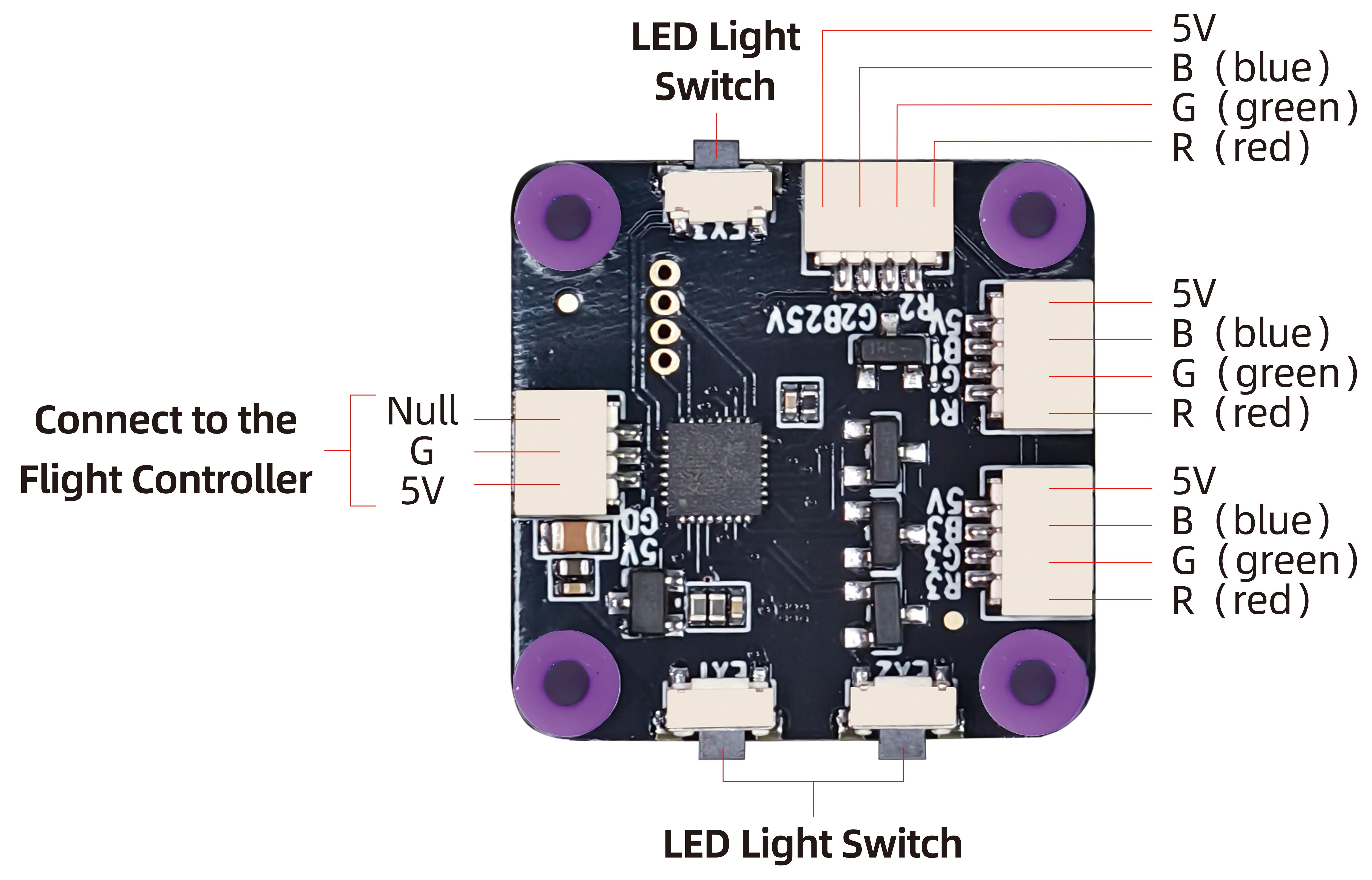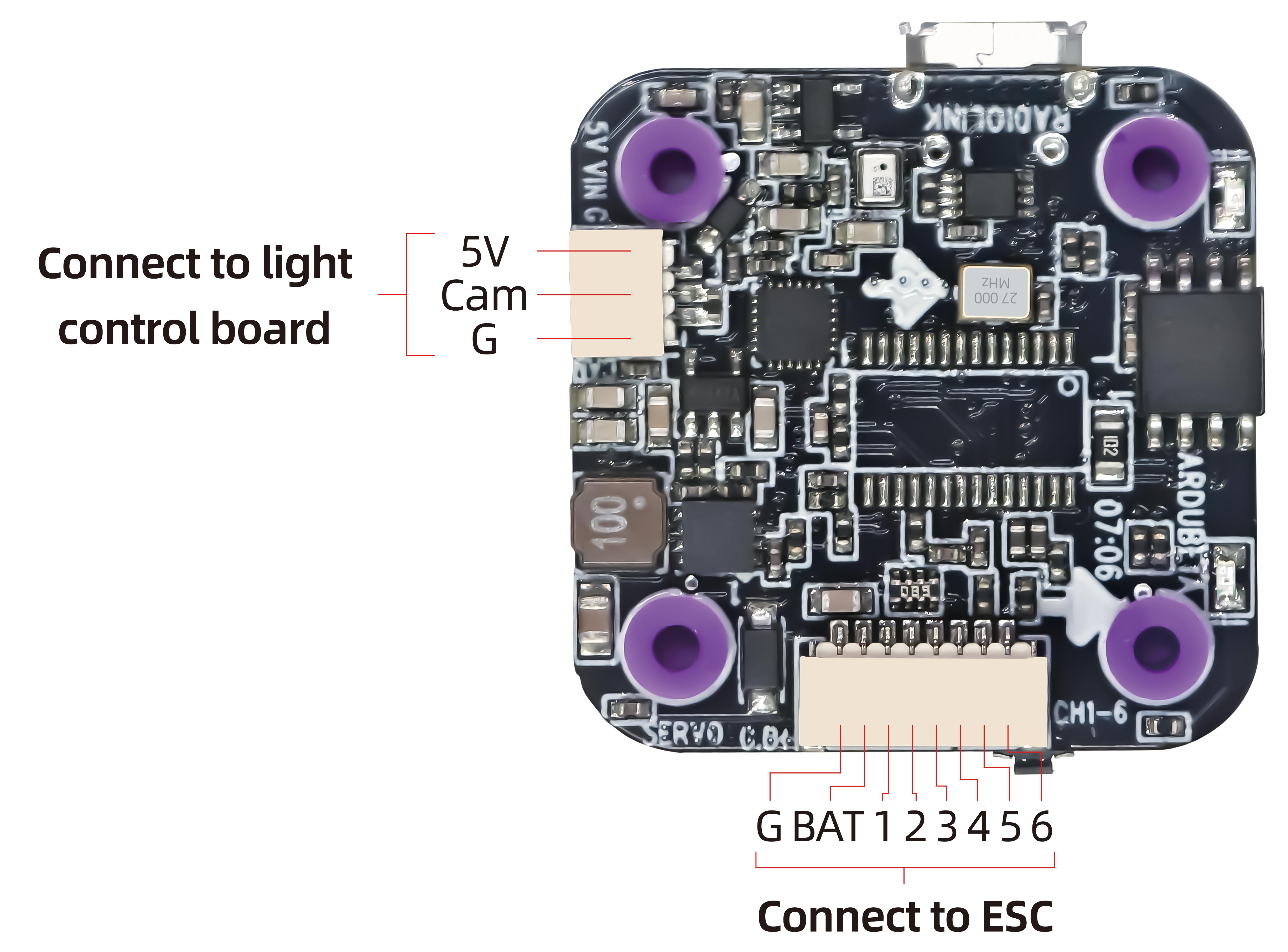 For LDZ-B20 PNP version, uses need to prepare the transmitter and receiver. The receiver needs to connect to the flight controller. Here is the socket introduction of the flight controller of LDZ-B20: