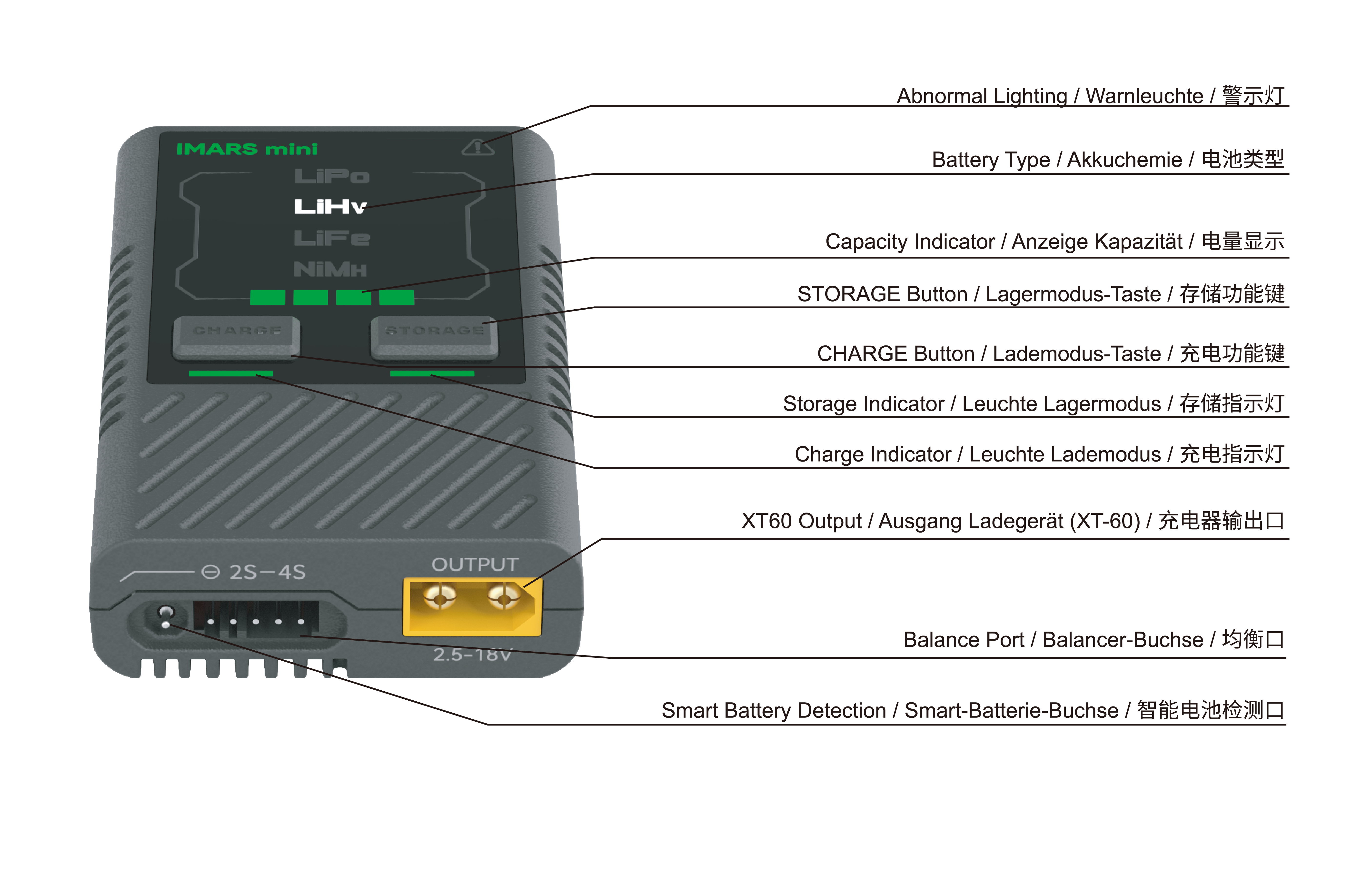 When connecting a non-smart battery, under the condition that the discharge connector and the balance connector are successfully connected, if you need to enter the charging mode, firstly short press any key to select the battery type, for lithium batteries, then you need to press and hold the CHARGE button for 2 seconds, but for NiMH batteries, you need to simultaneously press and hold the CHARGE and STORAGE buttons for 2 seconds to start the charging mode. After successfully entering the charging mode, the charger will beep, and the charging indicator light will lash at a frequency of 1Hz. The charger does not need to set the charging current. The charger will intelligently adjust the charging current to a suitable charging current according to the battery voltage fluctuation. During the charging process, the battery capacity indicator light will display the current real-time battery status. The charger will beep when the battery is fully charged, and the charging indicator light will remain on.