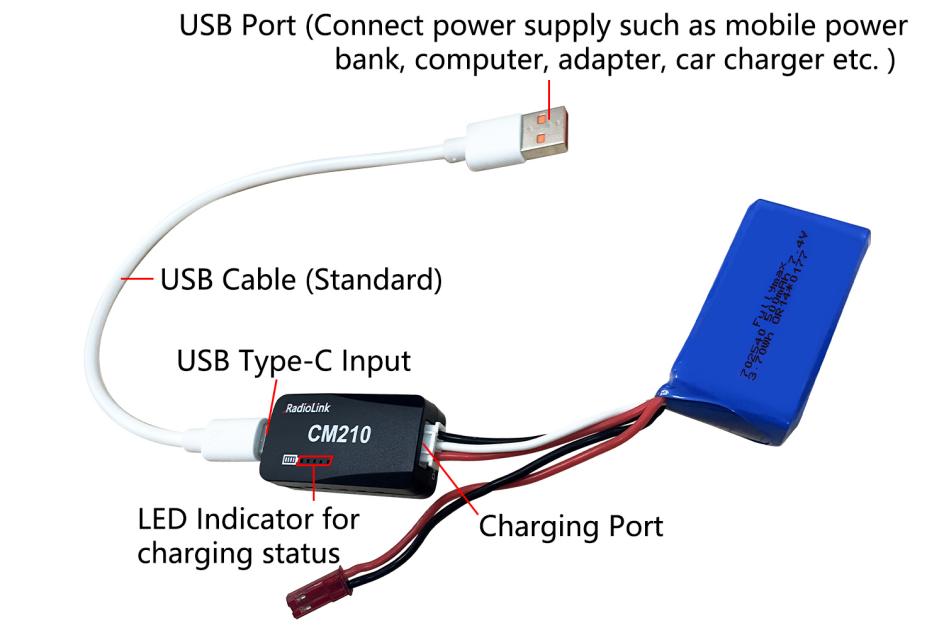Insert one end of the standard USB cable into the Type-C input port of the CM210 charger (as shown in the picture below), and then connect the other end of the USB cable to power supply equipment such as power bank, computer, mobile phone adapter, etc.. After the right connection, the red LED indicator will be always on.