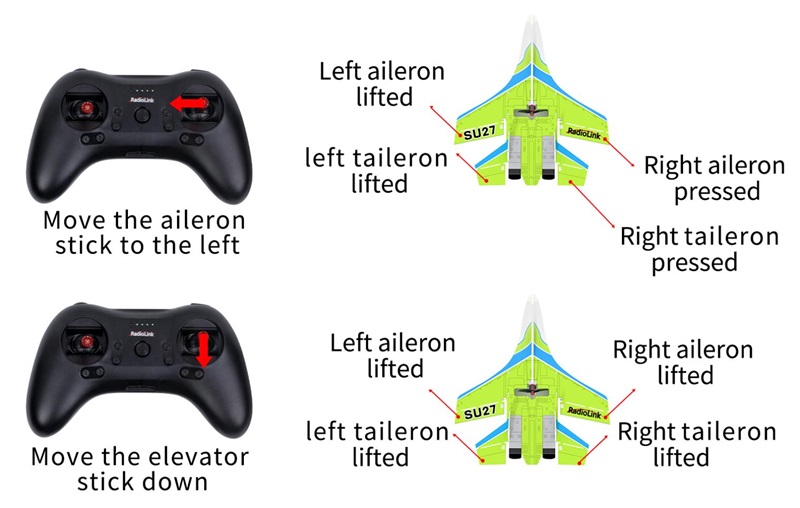 Move the aileron stick to the left, and the movement direction of the ailerons and tailerons is reversed | Aileron mix control reversed | Short press the button once | Green LED of CH1 on/off |