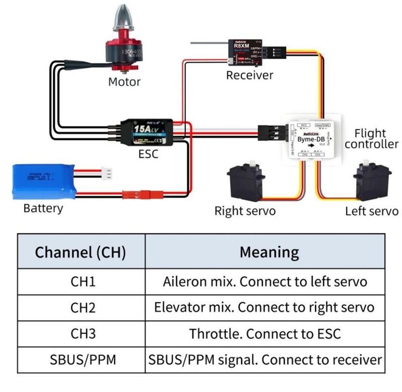 Note: Byme-DB comes with a receiver connect cable which is used to connect the receiver to Byme-DB. When connecting the servo cable and ESC cable to Byme-DB, please check whether the servo cable and ESC cable match the sockets/head of Byme-DB. If they do not match, the user needs to modify the servo cable and ESC cable, and then connect the cables to Byme-DB.