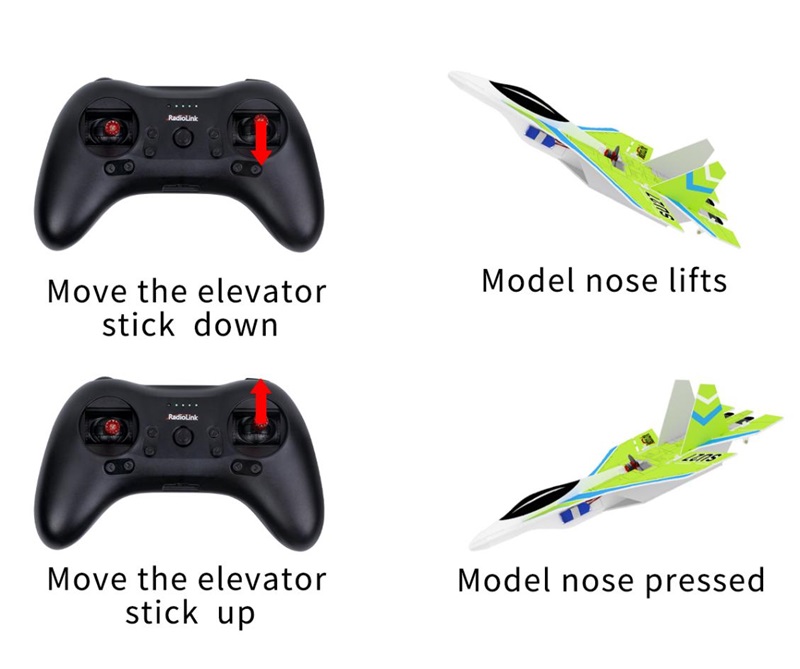 Move the elevator stick down, and the movement direction of the ailerons and tailerons is reversed | Elevator mix control reversed | Short press the button twice | Green LED of CH2 on/off |
