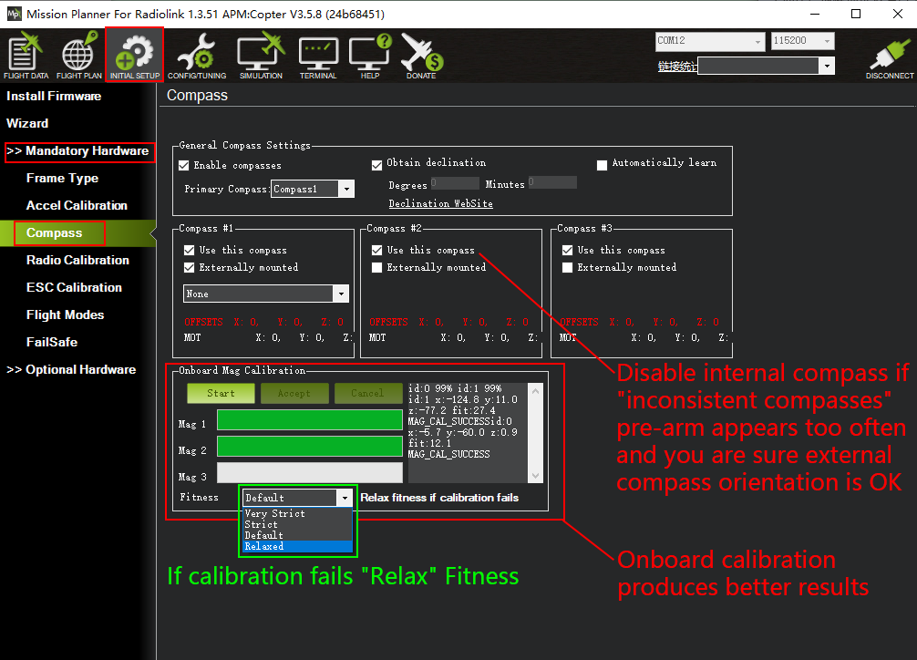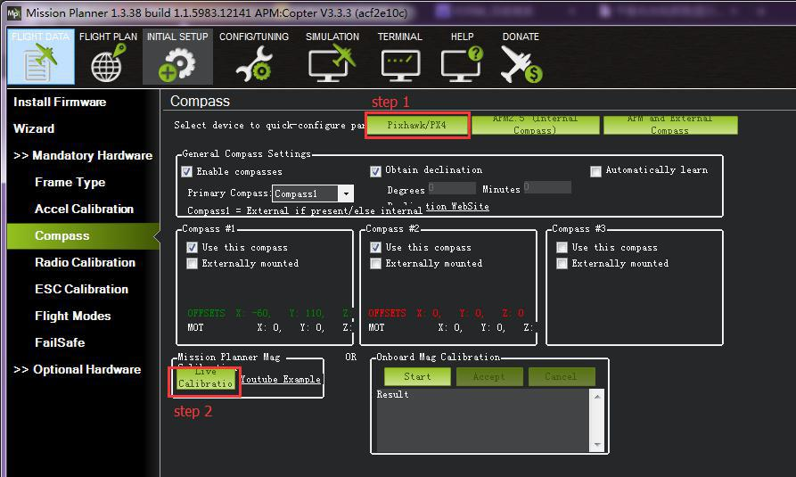 Compass calibration (using version 1.3.39 of Mission Planner), please choose Pixhawk/PX4 if you use it with the flight controller MINI PIX or PX4.