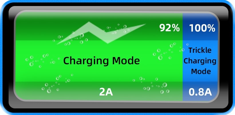 The battery capacity will be detected automatically during the charging process. When the battery is nearly fully charged (when the voltage is charged to 4.16V), it will switch to the trickle charging mode automatically, that is, it adjusts to the best 1C charging automatically, which improves the battery life while charging efficiently. Ensure the strong power of the battery and maximize the battery play life.