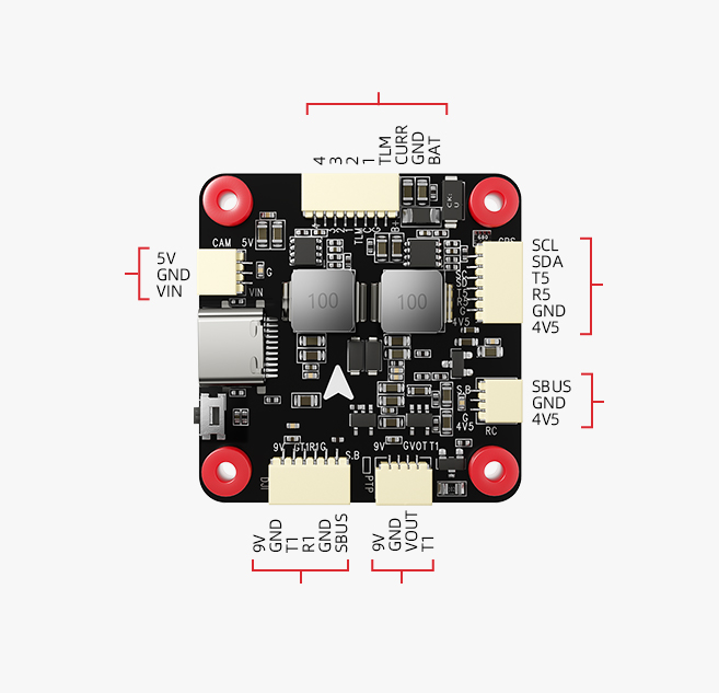*Integrated multi-channel BEC: 3.3V/300mA, 5V/3A, and 9V/3A outputs support external peripherals including receivers, FPV transmitters, cameras, servos, LED strips, and other types of devices.