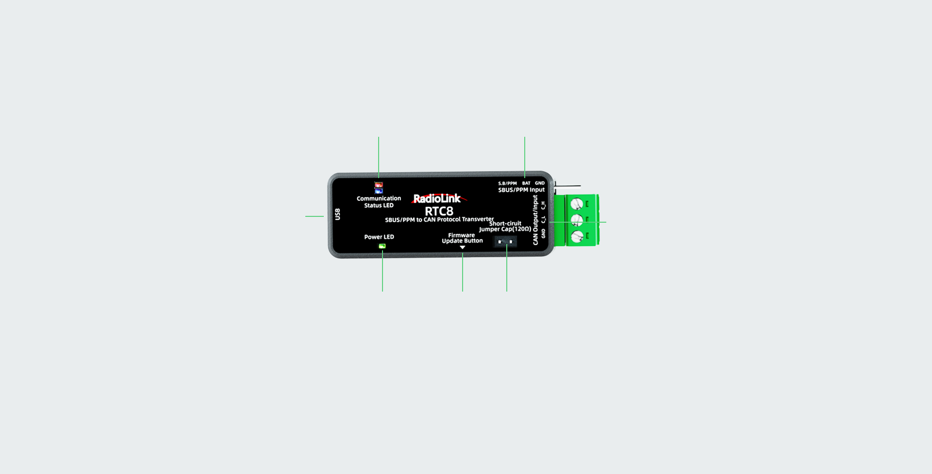Different LEDs switch automatically to identify whether the signal received is SBUS, PPM, or CAN data.