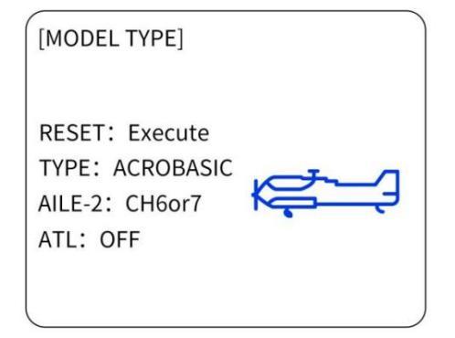 Steps: Power on the transmitter - Long press Mode to enter BASIC MENU - Turn the Dial to MODEL TYPE - Press Push to enter the menu and turn Dial to select ACROBASIC - Long press Push for 1 second and a notice “ARE YOU SURE”pops out - Press Push again and a notice”Please wait...” pops out and there will be DEE sound heard, meaning setting complete.
