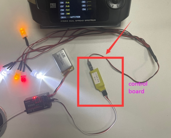 A: Set AUX-CH in the menu. Assign one channel to control the light. Make sure there is a control board with your light as below. If there is no control board, your light will be on all the time, but cannot be turned off with a switch.