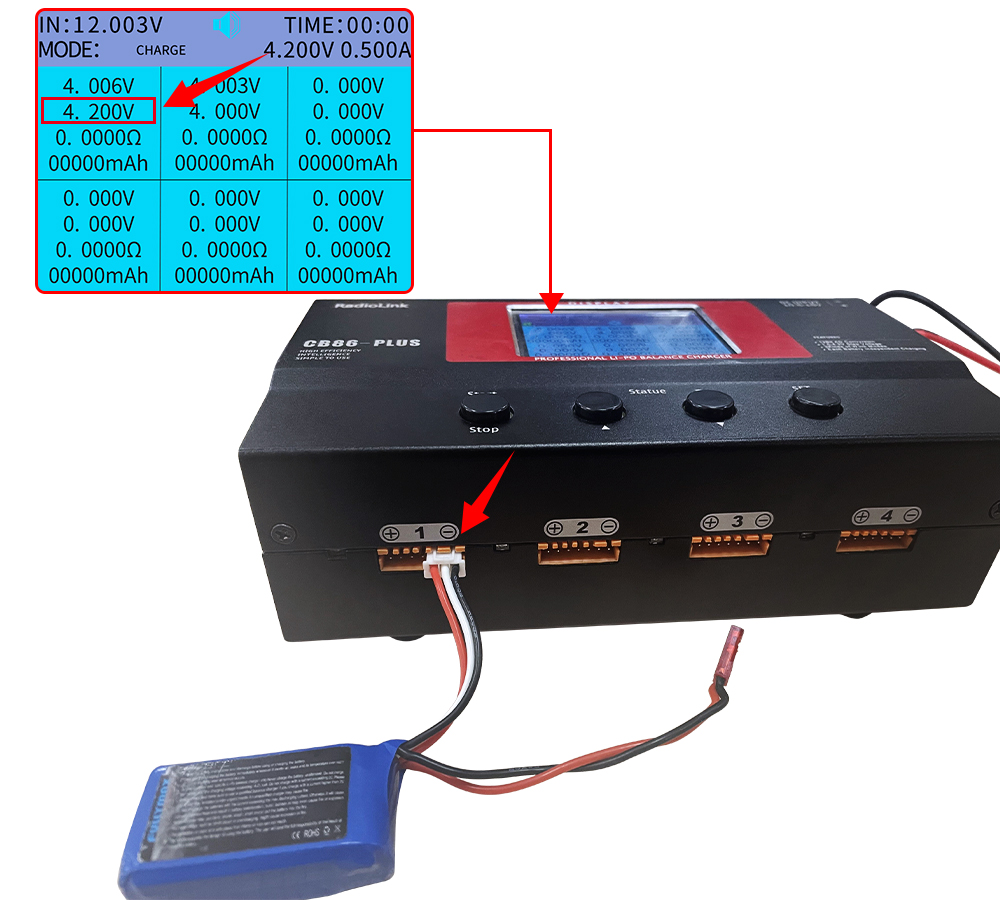 1. Before upgrading the firmware, plug the battery into the rightmost interface of port 1. Wait for 30 seconds and then check the voltage of each cell in port 1. Record the voltage value on the second row of the first box, as shown in the picture below. The battery voltage can be recorded as 4.200V in the picture (make sure that the cell voltage is between 3.8-4.4V). The power supply voltage can be recorded as 12.003V, shown in the upper left corner of the charger screen.