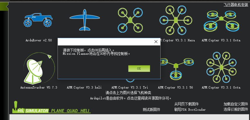 请先拔下USB线,点击OK,再马上插上USB线,然后自动完成连接识别飞控,刷入固件(请注意,在有多个COM口名称出现的情况下可能会出现失败情况,请先去除其他设备)