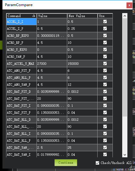 左边值代表飞控此时参数,右边值代表下载的新参数