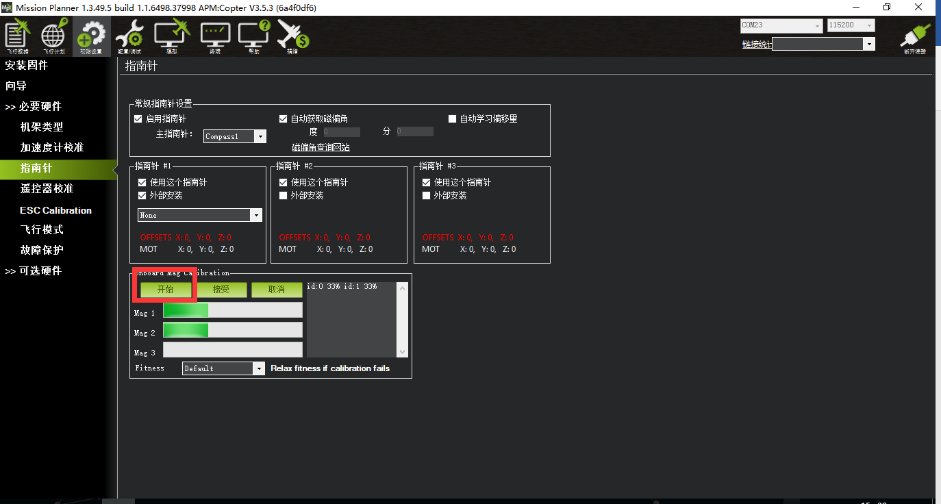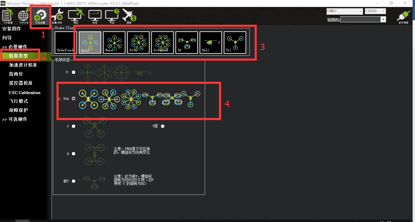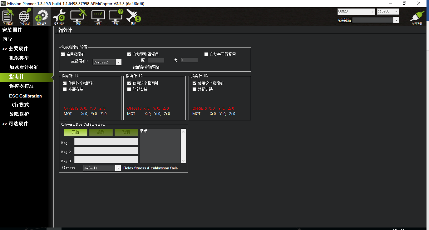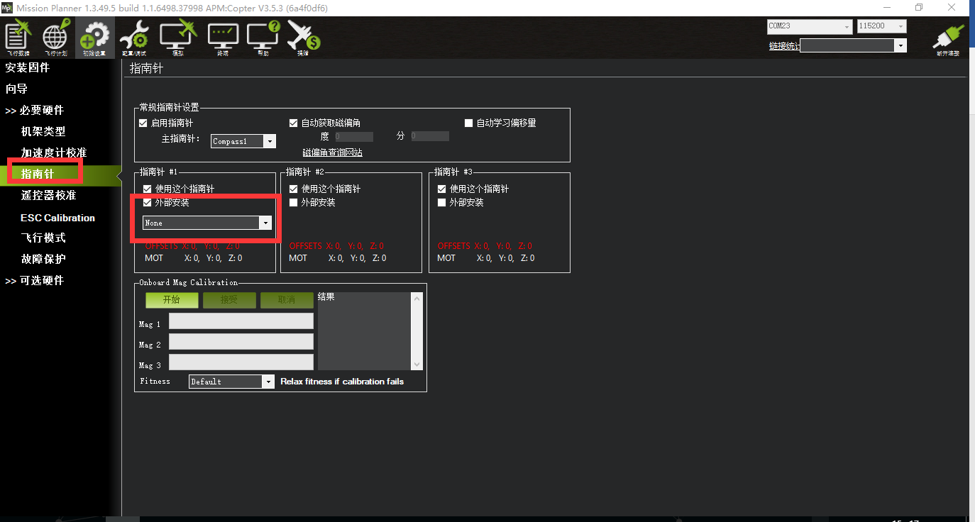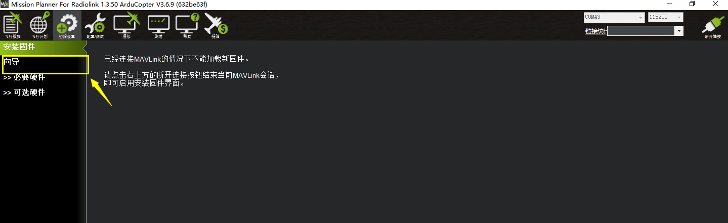 固件安装前请先连接Crossflight的USB线到电脑(普通的安卓手机数据线即可),确保电脑已经识别到Crossflight的COM口号后(如无法识别请查看2步骤的驱动安装失败解决办法),打开Crossflight专用地面站(以下简称MP),在MP主界面的右上方端口选择下拉框那里选择对应的COM口,然后波特率选择115200。