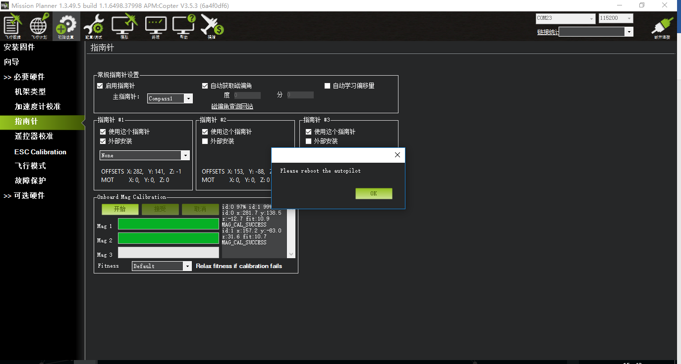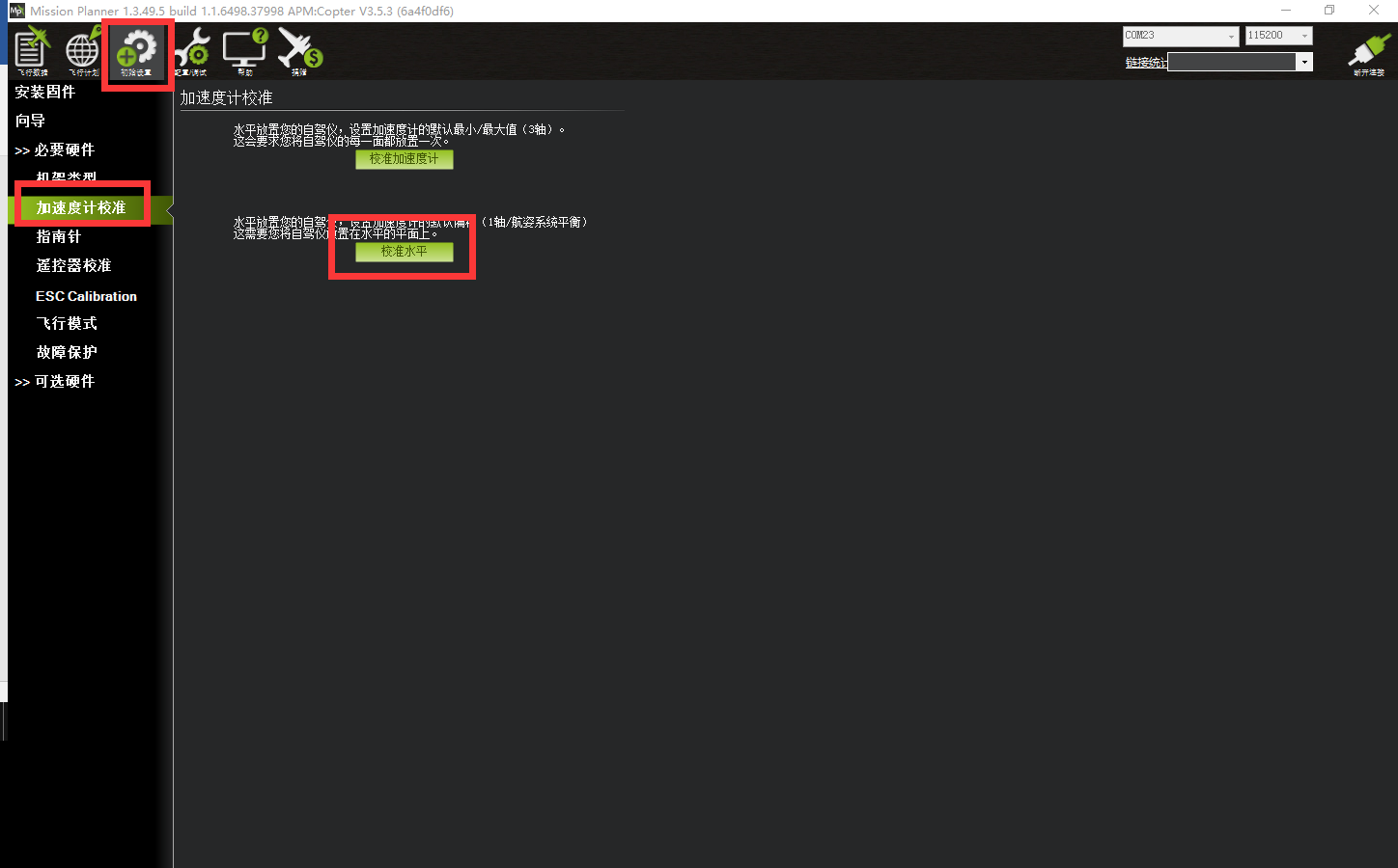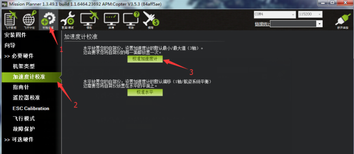 固件安装提示Done成功后,你就可以点击右上角的connect连接按钮连接飞控,进行设置校准