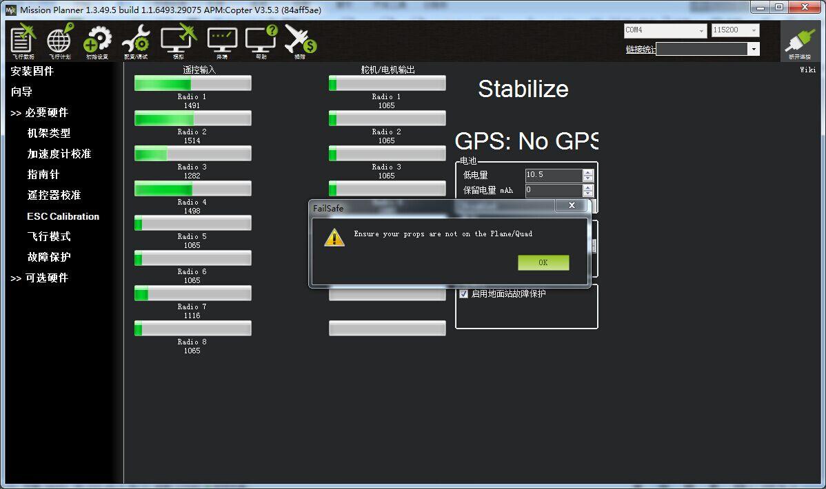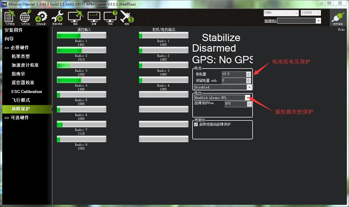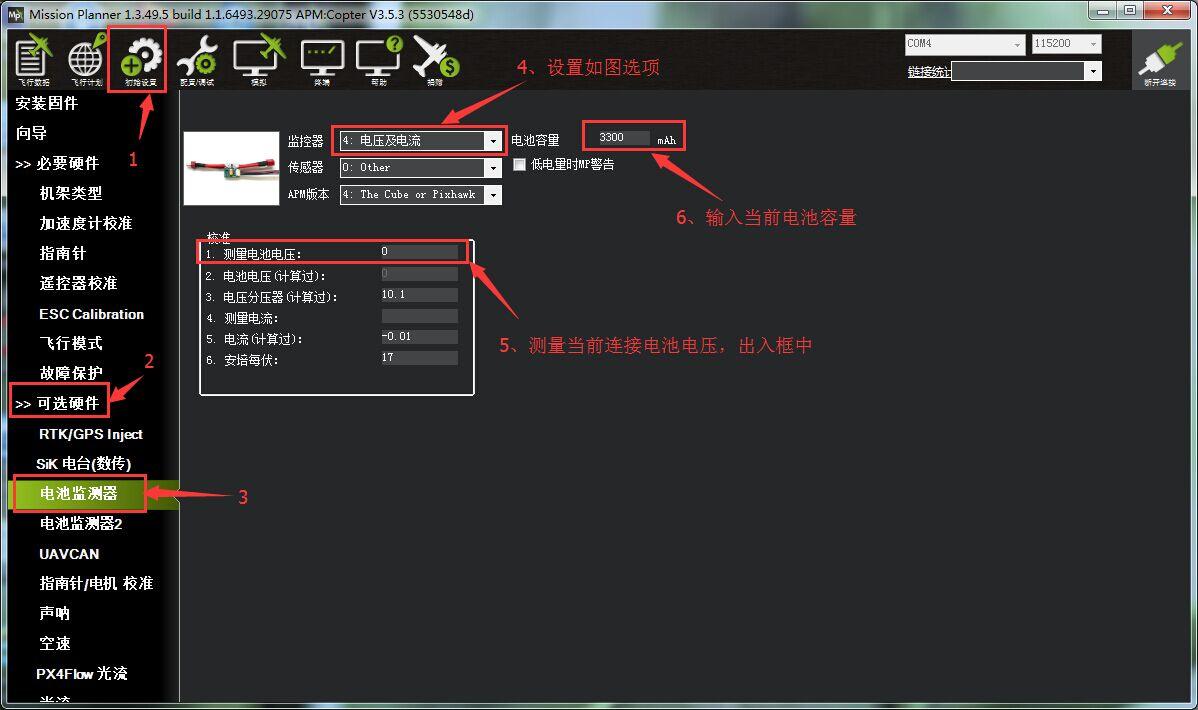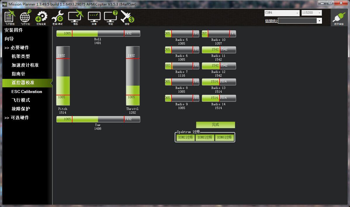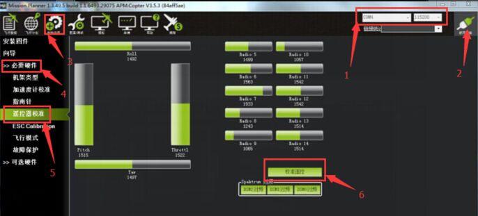 运行 MP,按下图步骤选择好波特率与端口后点击connect连接飞控,接着点击初始设置——必要硬件——遥控器校准——点击窗口右边的校准遥控按钮