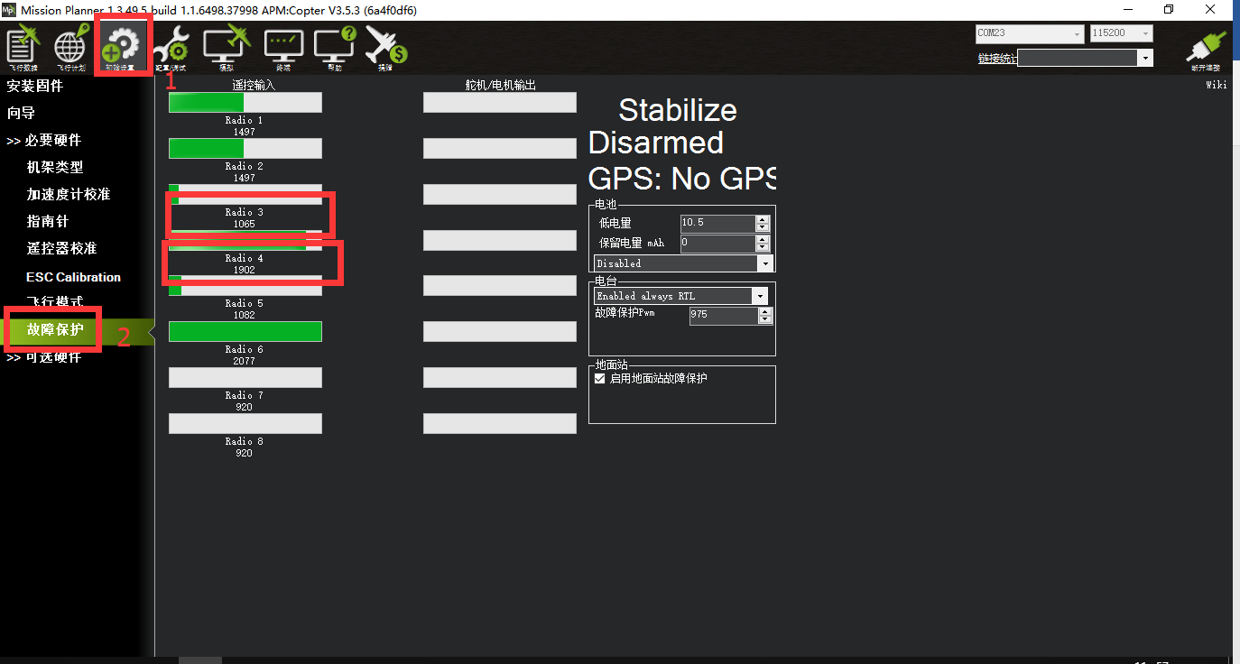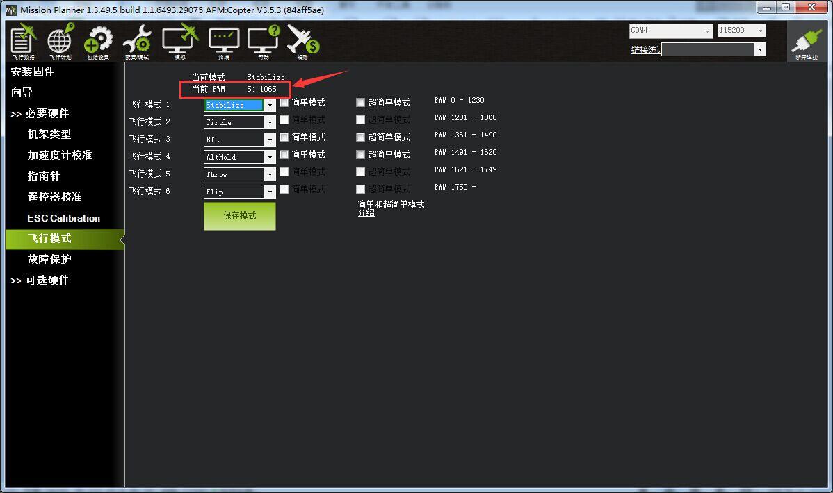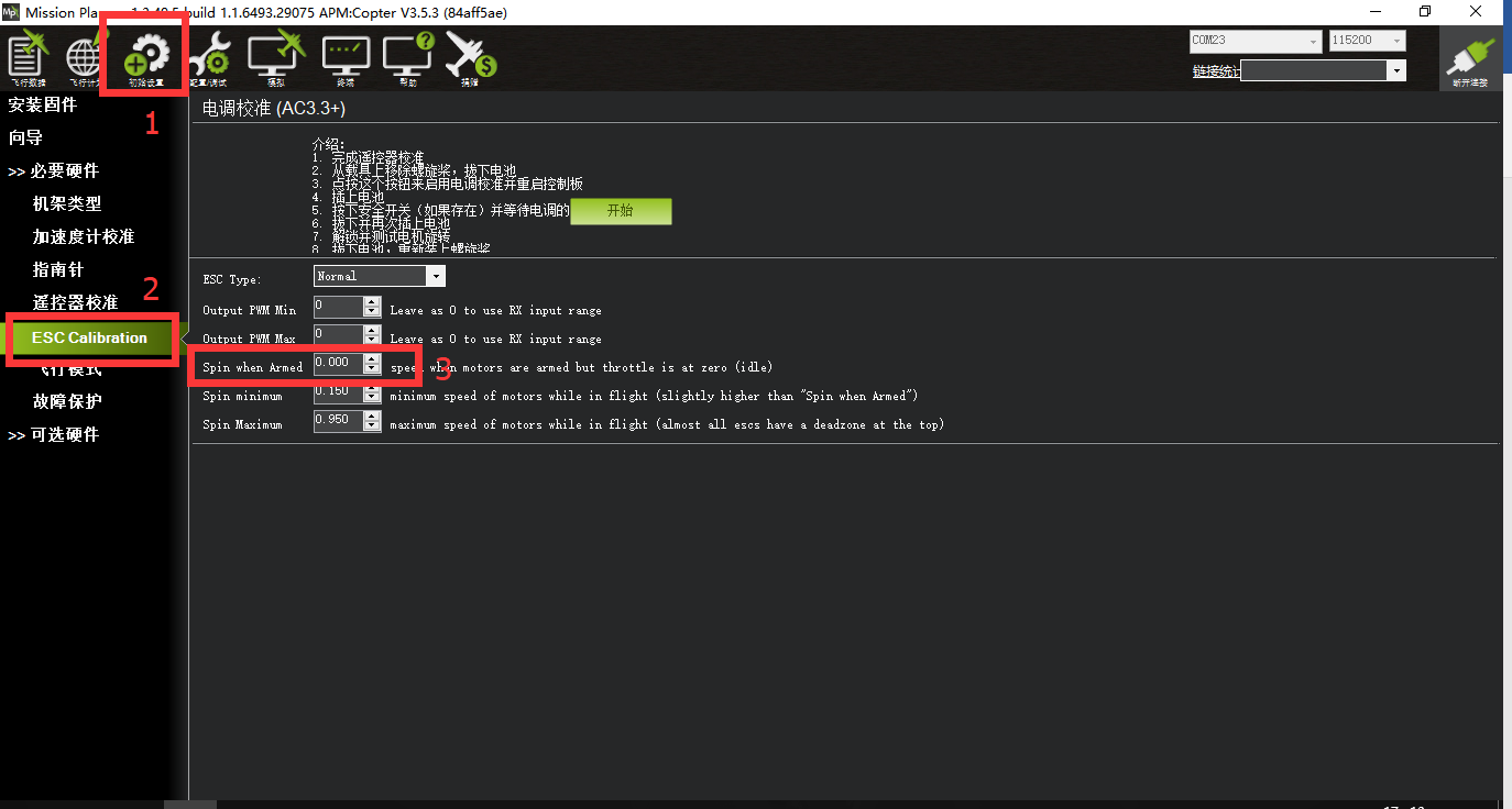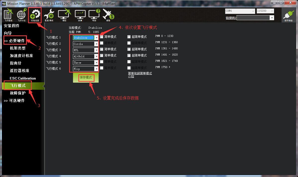 运行 MP,按下图步骤选择好波特率与端口后点击connect连接飞控,接着点击初始设置——必要硬件——遥控器校准——点击窗口右边的校准遥控按钮