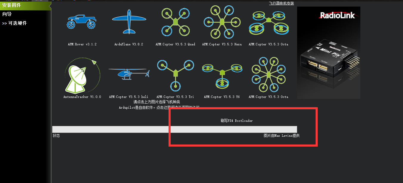 也有可能出现假死界面显示已经连接飞控,不用担心此时也在进行刷写固件,可以查看飞控状态指示灯红色常亮,此时正在刷写固件