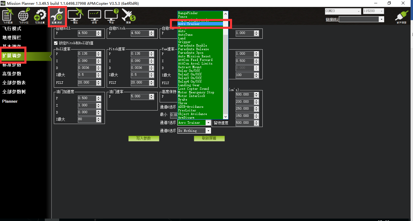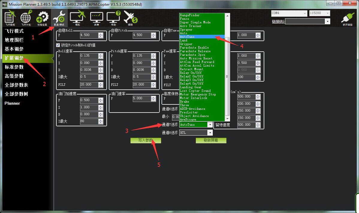 自动调参功能可以自动调整Stabilize P和Rate P、Rate D的参数,从而得到更高的灵活性,也不会有大的超调。 通过在飞行中自通过不断的roll和pitch动作中来得到最佳的PID参数,所以在使用自动调参前必须切换至定高模式。