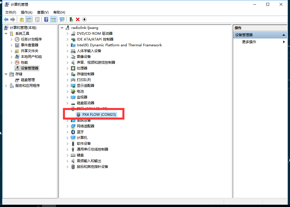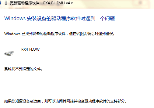 打上补丁后再重新检索安装驱动程序,驱动是否成功安装的标志就是在设备管理器中正确识别了标识为PX4FLOW的端口号。