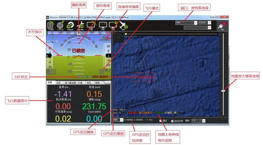 首先安装地面站控制软件及驱动,熟悉地面站界面的各个菜单功能;
