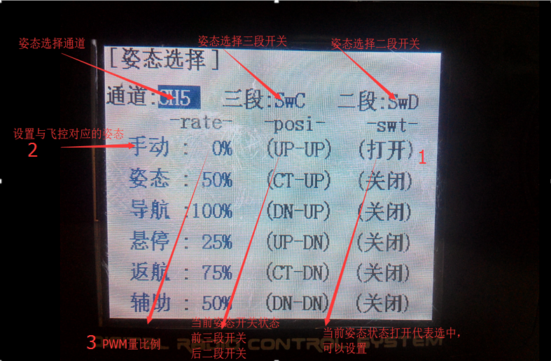 2. 把通道7或者通道8设定为自动调参的开关或飞行模式中设置为自动调参