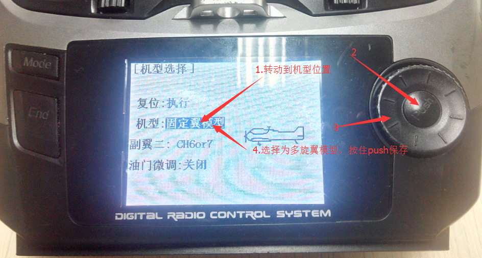 1. 按Mode键,进入基础菜单,选择机型选择,进入拨动拨盘到机型选项,按Push进行选中,拨动拨盘,选择多旋翼模型,按Push键等待滴滴响声结束即保存模式,之后按End退出