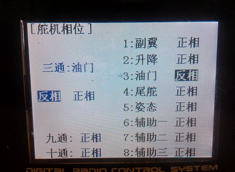 2. 因为对于AT9S遥控器,需要把油门反相,所以请按Mode键,进入基础菜单,选择舵机相位,选择3:油门,按Push选中,拨动拨盘选择到反相,按Push选中保存,按End退出即可,遥控器设置完成