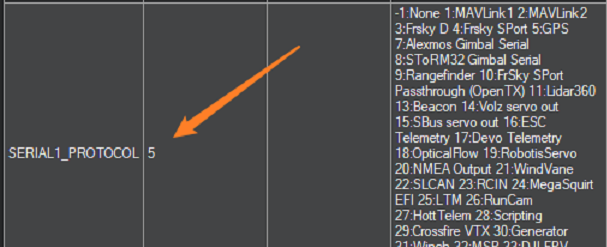 ② Enter Software Config -- Full Parameter List, then search for “SERIAL1_PROTOCOL”, and change the va lue to “5”.
