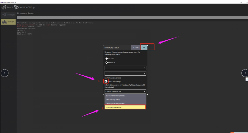 (4)Check Advanced settings, select Custom firmware file and click Ok: