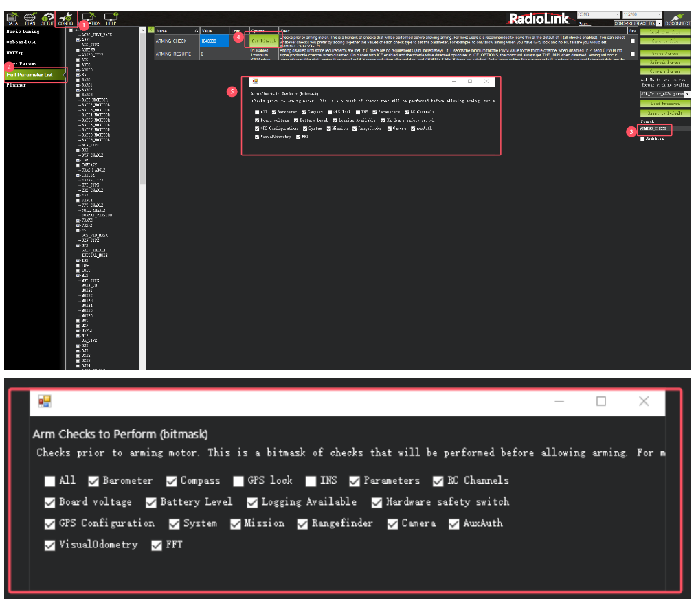 A: Set the ARMING_CHECK in Full Parameter List in RadioLink Mission Planner as 0.