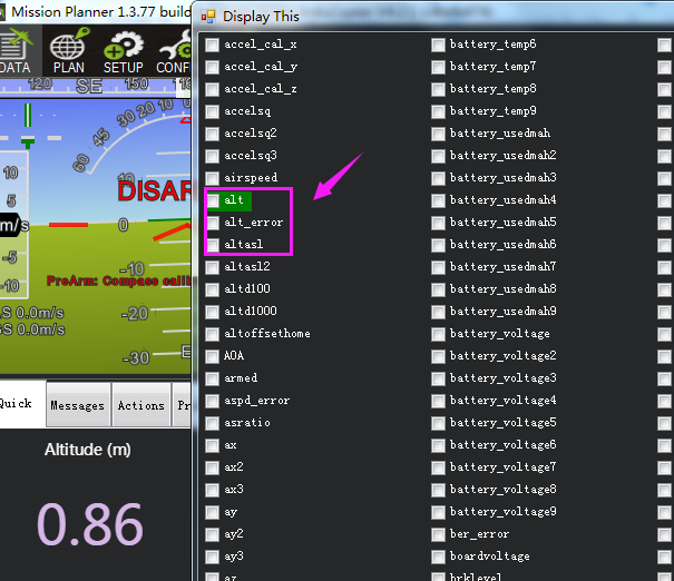 A: The altitude displayed in Mission Planner includes relative altitude and absolute altitude, depending on the setting options in Mission Planner. Double-click the "Altitude (m)" at the bottom left, and the parameter options will pop up.