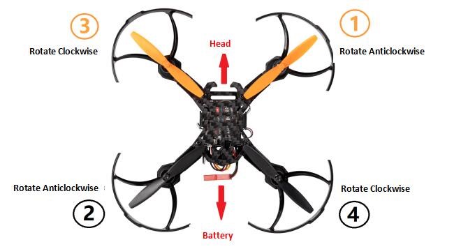 In order to distinguish the correct rotation of the propellers, we can observe the right part of each prop with a higher part (windward surface) at the front. It it rotates anticlockwise with the motor, there are letters marked on it as CCW (counterclockwise). On the contrary, if it's clockwise rotation, then letters marked on the prop are CW (clockwise).