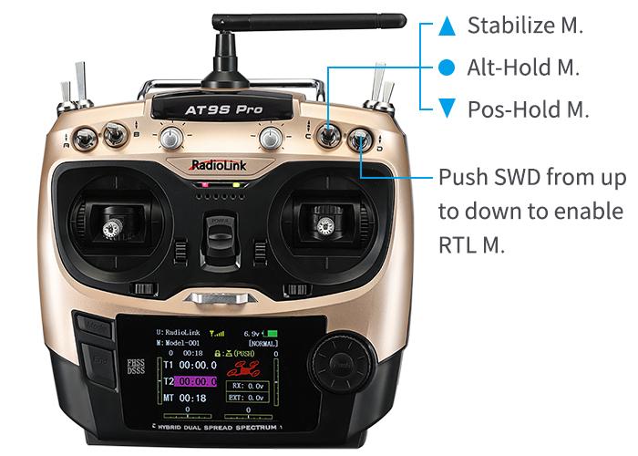 For AT9S Pro, the 3-way switch (SWC on the right) by default, UP is Stabilize Mode, MID is Alt-Hold Mode, DWN is Pos-Hold Mode. Push SWD from up to down to enable RTL Mode.