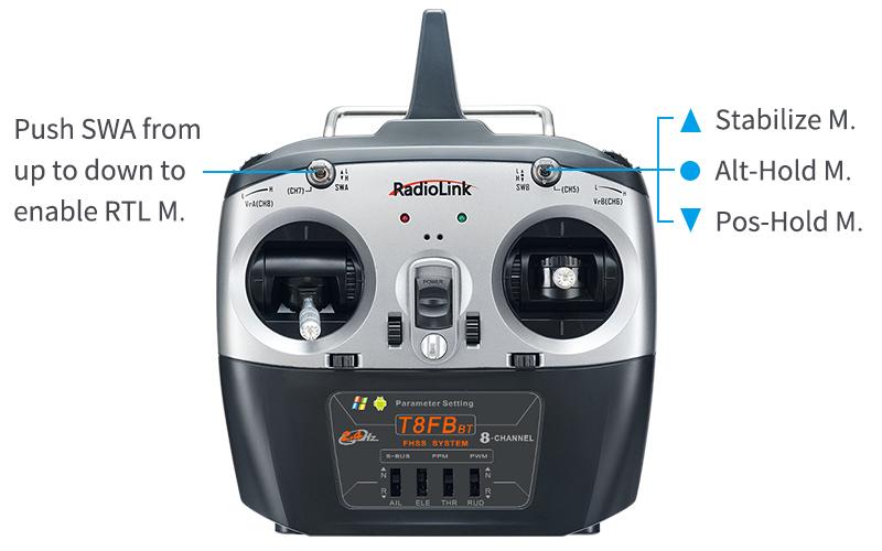 For T8FB,the 3-way switch (SWB on the right) by default, UP is Stabilize Mode, MID is Alt-Hold Mode, DWN is Pos-Hold Mode. Push SWA from up to down to enable RTL Mode.