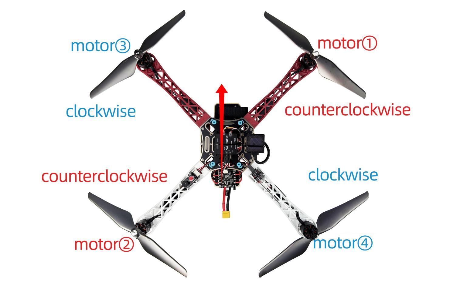 As the image shown below, put the head with camera forward when installing props and make sure propellers on Motor 1 and 2 rotate counter clockwise while that on Motor 3 and 4 are clockwise.