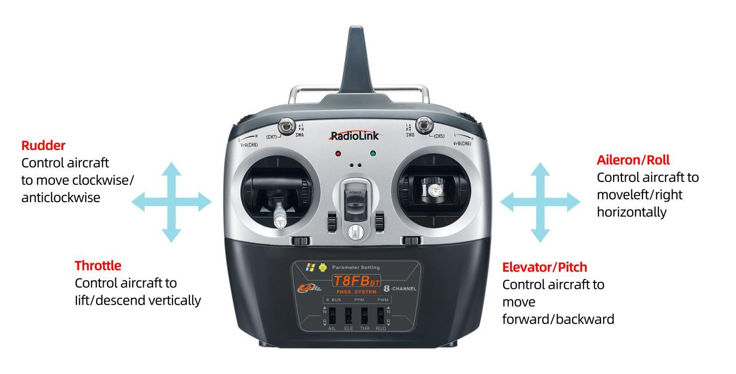 The left stick controls the throttle by toggling up and down to make aircraft lift and descend vertically and the rudder by toggling left and right to make aircraft turn clockwise and anticlockwise.