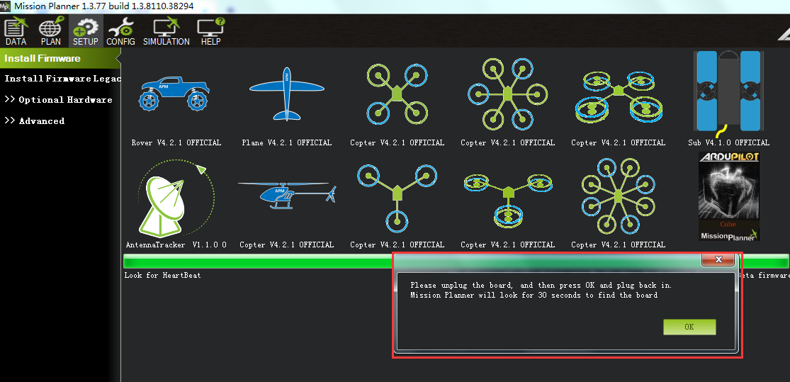 Please connect your PIXHAWK and computer via USB cable(other devices do not need to be connected). Open the Mission Planner to loading the firmware you need to your PIXHAWK.