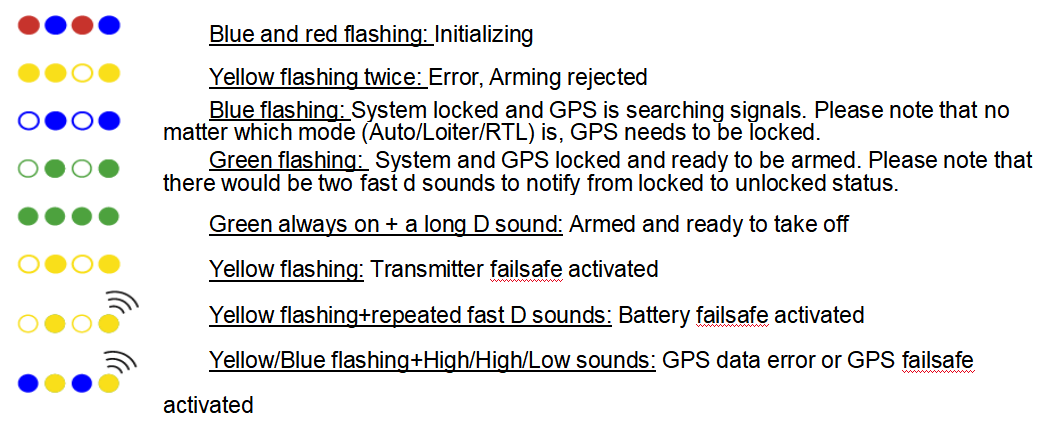 2. Connect the Lipo battery. The autopilot’s red, blue and yellow LEDs will light up in a cyclical pattern. This means the it’s ready to go into ESC calibration mode the next time you plug it in.