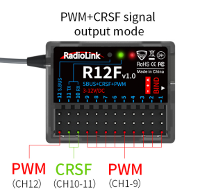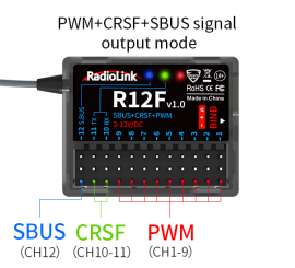 R12F supports three signal outputs: PWM, SBUS and CRSF. It has four working modes in total.