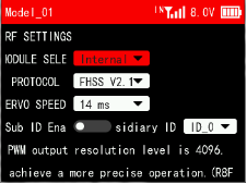 If R12F is used together with T16D/T12D, please select receiver protocol in the transmitter. Enter Transmitter Setting--RF SETTING,and then select the protocol. R12F supports FHSS V1, FHSS V2 and FHSS V2.1 protocol. It is recommended to select FHSS V2.1 protocol. For the differences of the protocols, please refer to the table below: